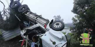 Flipped big rig closes Hwy 1 offramp at Riverside Drive