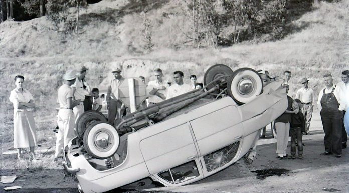 A crowd gathers around a vehicle crash at Larken Road and the freeway on Sept. 4, 1954. (Sam Vestal/Pajaronian file)