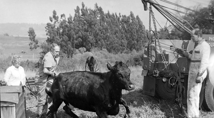 Rescuers had to use a tow truck to yank a cow out of a well on Linden Road on April 8, 1957.