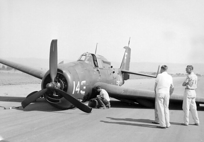 These men examine the damage in a plane crash at the Watsonville Airport on Sept. 25, 1954. According to aviation history buff Gary Plomp, the plane is a Grumman TBF-5 Avenger Carrier, which was used in WWII as torpedo bombers and level bombers. TBFs were based at Watsonville Airport during the war.