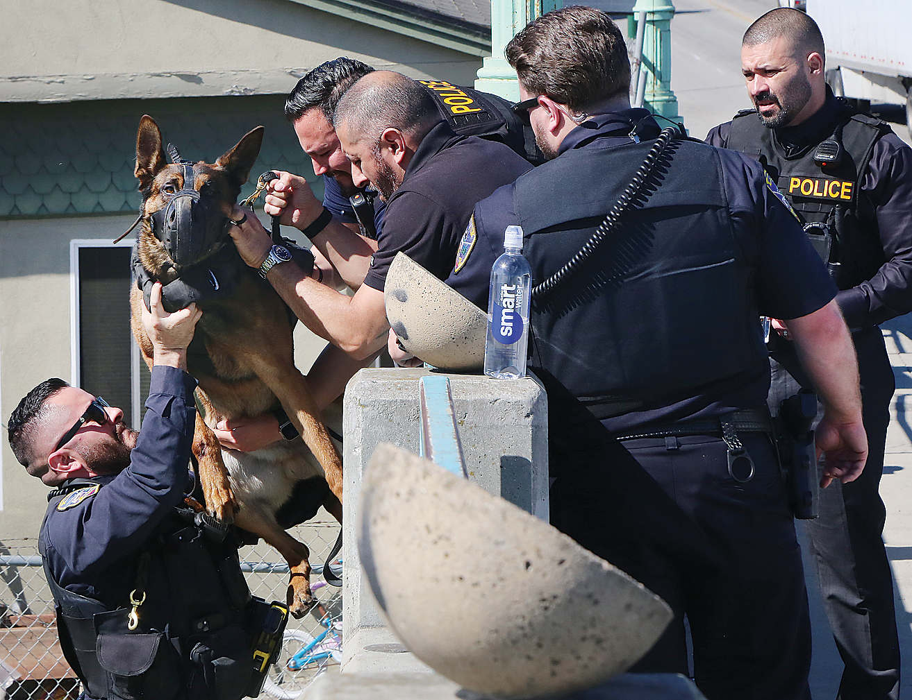 Watsonville police hoist a K9 over a rail on the Main Street bridge over the Pajaro River levee after they chased down a felony suspect. (Tarmo Hannula/The Pajaronian)