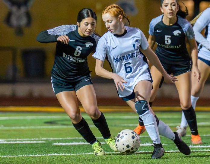 Aptos High junior Bella Hartnett, right, has a team-leading 16 goals to go along with five assists for the Mariner girls' soccer team, which is 6-0 in Santa Cruz Coast Athletic League play as of Jan. 30. (Raul Ebio/The Pajaronian)