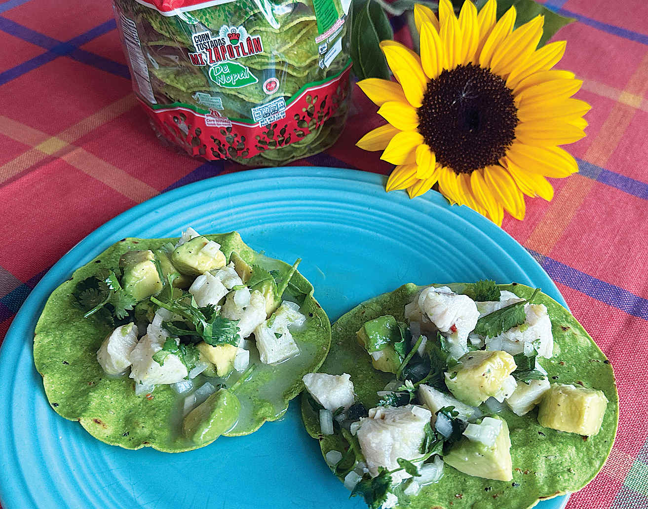 The chunks of marinated fish can be scooped up with tortilla chips or served on tostadas. I found a green colored tostada that I have never seen before at D’la Colmena, at 129 W. Lake Ave. in Watsonville. It’s made with nopales and corn and is from the company Mi Zapotlán. Los Pericos also makes a good tostada. White onions have a milder and sweeter flavor with less sulfur than yellow onions and are more commonly used in European and Mexican cooking. You might want to cut the recipe in half if there are only a few of you.