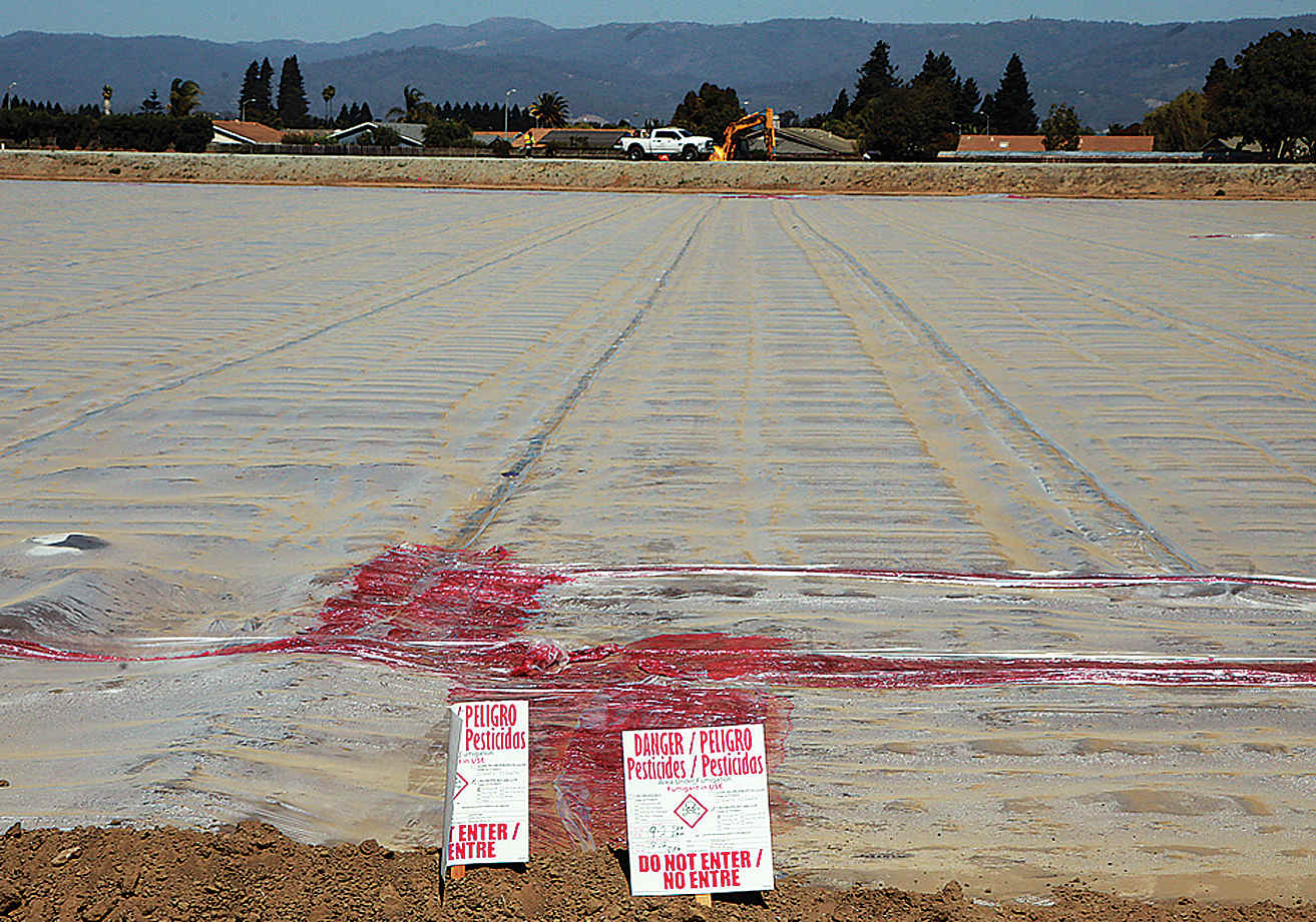 Signage warns of dangerous pesticides in use on a plastic-covered agricultural field on San Juan Road in Monterey County. (Tarmo Hannula/The Pajaronian file)