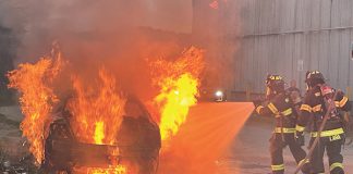 Watsonville firefighters battle flames erupting from a car in Pajaro Wednesday evening. An official with North Monterey County Fire said there were no apparent...