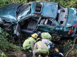 A Watsonville firefighter secures the scene of a solo vehicle crash Friday.
