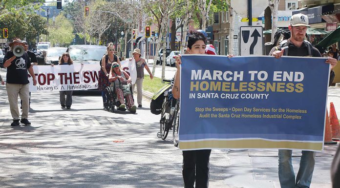 About a dozen people march March 29 in downtown Santa Cruz to garner awareness and support for homeless people. Put on by Food Not Bombs and the Homeless Union, their message to the people along Pacific Avenue was to stop the sweeps of homeless...