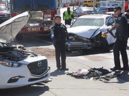 Emergency officials deal with a two-vehicle crash Wednesday on the 2500 block of Freedom Boulevard. The California Highway Patrol said the male driver of a Ford F550 flatbed pickup towing an 18-foot flatbed trailer was traveling north on Freedom Boulevard when he attempted a...