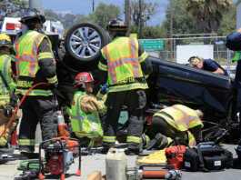 Emergency officials check on a VW Golf that ended up on a Main Street sidewalk Friday following a two-vehicle crash.