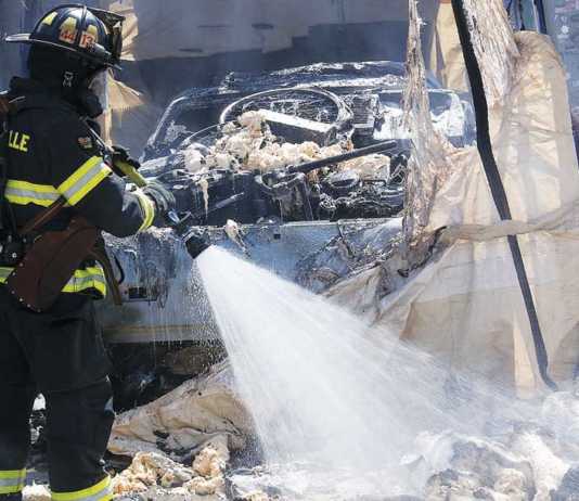 The collision on the 900 block of Green Valley Road north of Casserly Road at 7:30am caused the bus to burst into flames.