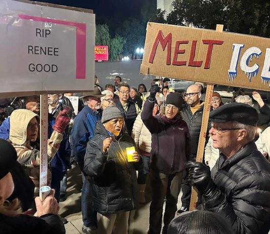 Around 150 people gathered in Watsonville Plaza Thursday night in a vigil for 37-year-old Renee Nicole Macklin Good, who was shot and killed by...