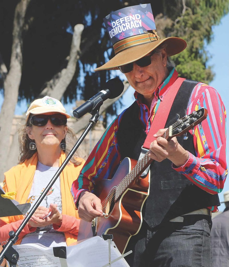 Watsonville Poet and singer Bob Gomez heads up a protest song during the protest. (Tarmo Hannula/The Pajaronian)