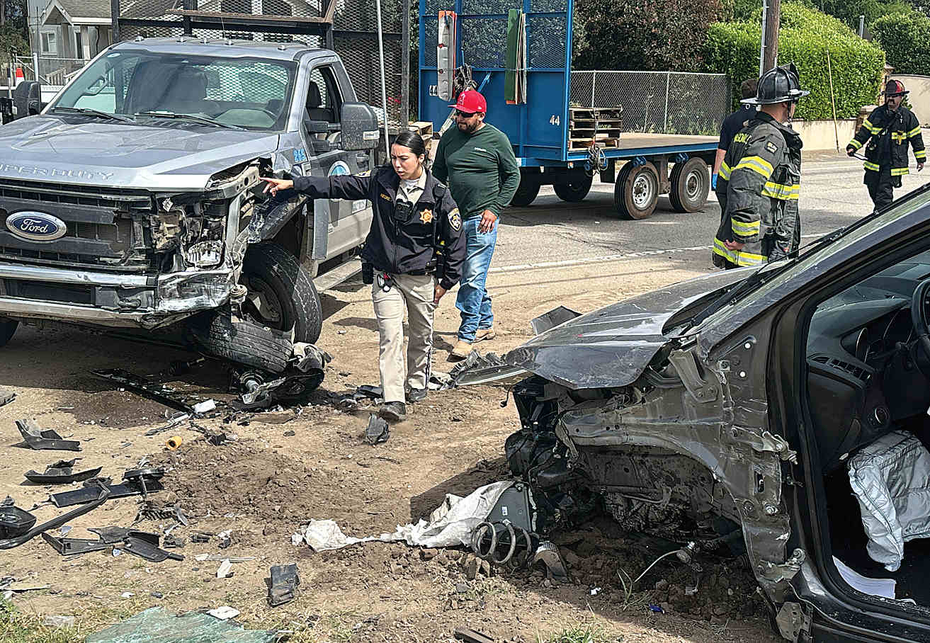 Emergency officials deal with a two-vehicle crash Wednesday on the 2500 block of Freedom Boulevard. The California Highway Patrol said the male driver of a Ford F550 flatbed pickup towing an 18-foot flatbed trailer was traveling north on Freedom Boulevard when he attempted a left turn into an agricultural field around 1:50pm. His pickup collided with the front end of a Ford Escape SUV with a female driver who was traveling south. The impact briefly trapped the female in her heavily damaged SUV. Firefighters from Cal Fire and Watsonville Fire safely extricated her. She was then taken to an out of county trauma center by American Medical Response. The incident is still under investigation. (Tarmo Hannula/The Pajaronian)