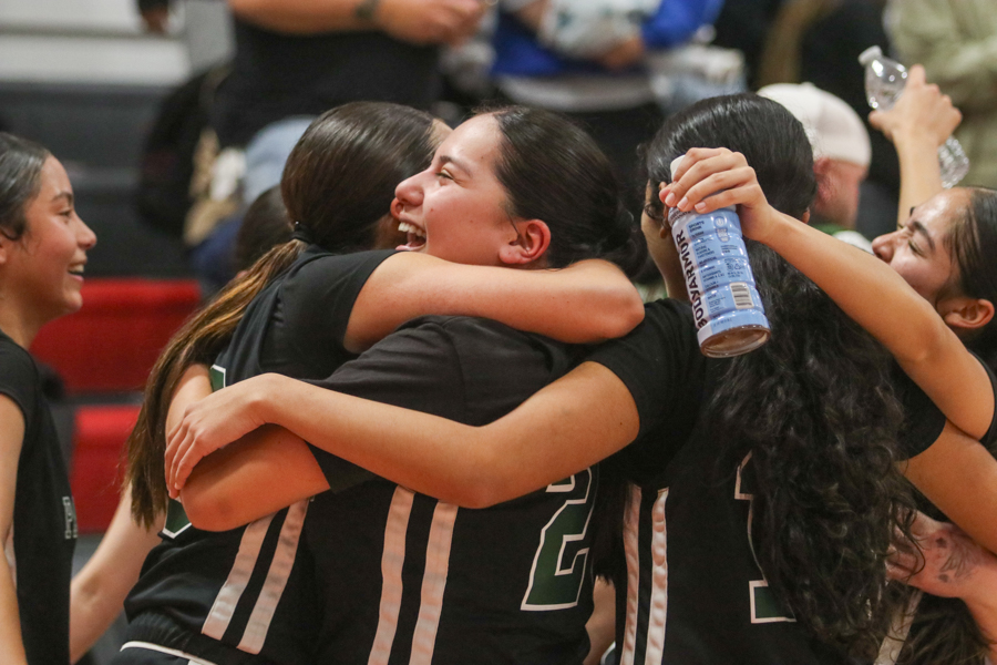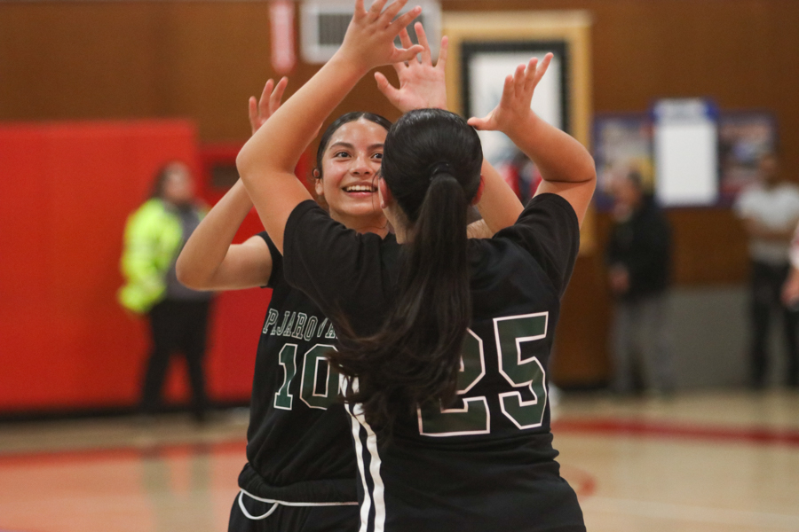 Pajaro Valley High sophomore Elizabeth Zamora, No. 10, celebrates with teammate sophomore Karley Alvarado following a 36-30 win over North Salinas on Feb. 13. With the win, the Grizzlies secured a share of the Pacific Coast Athletic League Cypress Division crown. (Juan Reyes/The Pajaronian)