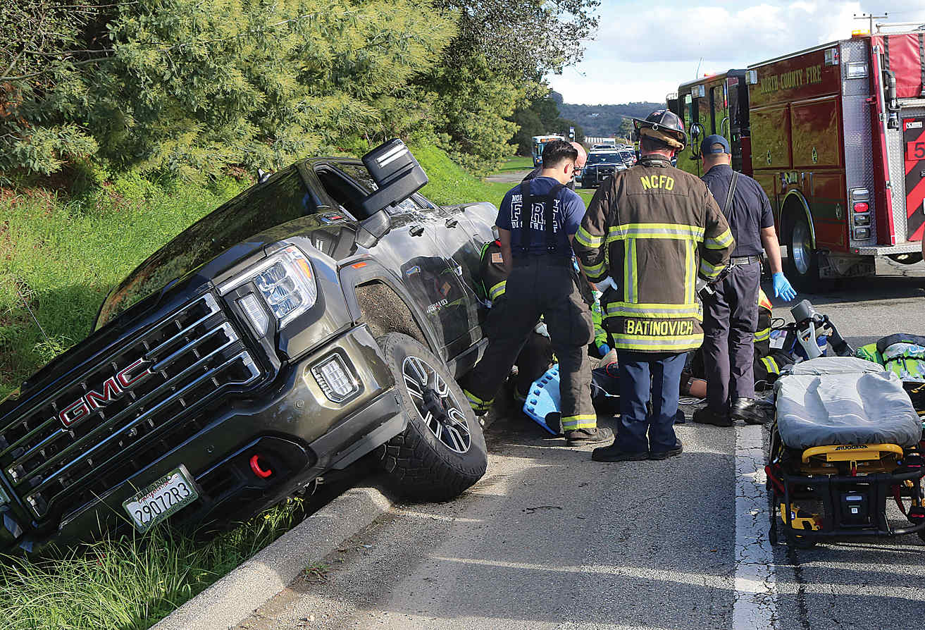 North Monterey County Fire officials join American Medical Response paramedics in treating the male driver of a pickup who veered off of Hall Road Jan. 6 in Las Lomas. The California Highway Patrol said the man lost control of a GMC around 2:30pm while traveling west on Hall Road just east of Johnson Road. Only minor injuries were reported. No other vehicles were involved.