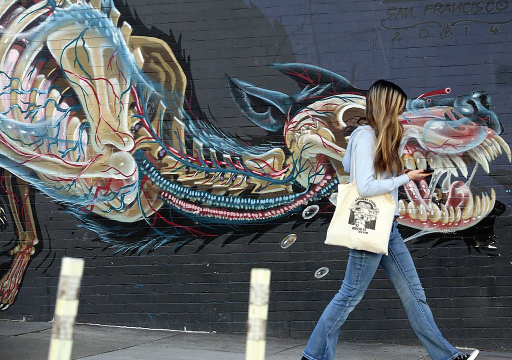 After breakfast in the Hotel Triton lobby we packed up and drove along The Embarcadero, past the historic 1898 Ferry Building. According to Ferry Building Marketplace, the harborside hub served as a transportation focal point for anyone arriving by train, ferry, on foot or horseback. From the Gold Rush until the 1930s, arrival by ferry became the primary way for travelers and commuters to reach the city. At its peak, as many as 50,000 people a day commuted by ferry around the Bay Area. My great aunt Emily told me of numerous ferry trips she and her friends took from Sacramento to San Francisco, sometimes just for the day. Nowadays the place features scads of businesses and eateries as well as a farmer’s market where we’ve seen several vendors from the Pajaro Valley. Open year round, the market runs Saturdays, Tuesdays, and Thursdays from 10am-2pm.