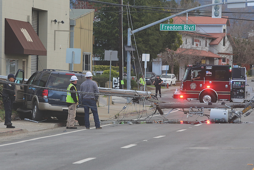 Watsonville Fire and police arrived and shut down Airport Boulevard between Freedom Boulevard and Roache Road. The driver remained trapped in her vehicle until PG&E officials arrived and de-energized the 21,000 volt lines. The impact caused power outages in the area of Freedom Boulevard, Airport Boulevard and Green Valley Road.