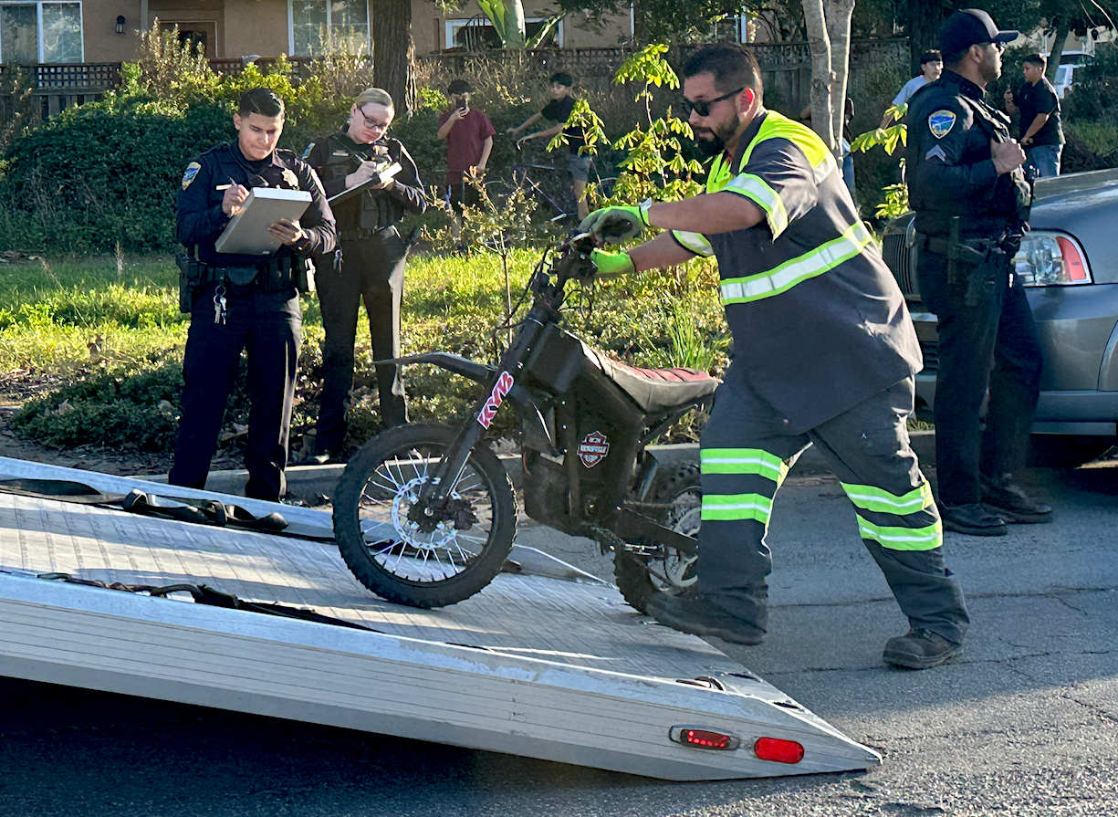 A tow operator lifts one of two electric dirt bikes onto a flatbed truck after being stopped by Watsonville Police on Bridge Street Tuesday afternoon. Sgt. Jarrod Pisturino said WPD has received numerous complaints about youths speeding through and around the Vista Montaña housing project off of East Lake Avenue at Bridge Street. When police arrived around 5pm, two teen males sped off on the E-bikes, leading police in patrol cars and a motorcycle on a lengthy, twisting chase around the complex, up and down Bridge Street, onto the Corralitos Creek levee, along sidewalks and around baseball diamonds. WPD eventually caught both of them, took the pair of teens into custody and impounded their bikes that are not legal on public property, roads, public parks or sidewalks.