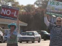 A group of abut a dozen people wave their signs advocating for YES of Proposition 50 Monday on the Rio Del Mar over-crossing to...